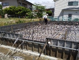 鉄筋が組み終わったら、第3者機関の検査を受け問題がなければコンクリートを打設します。 今週は天気が良く順調に工事が進めることができています。
