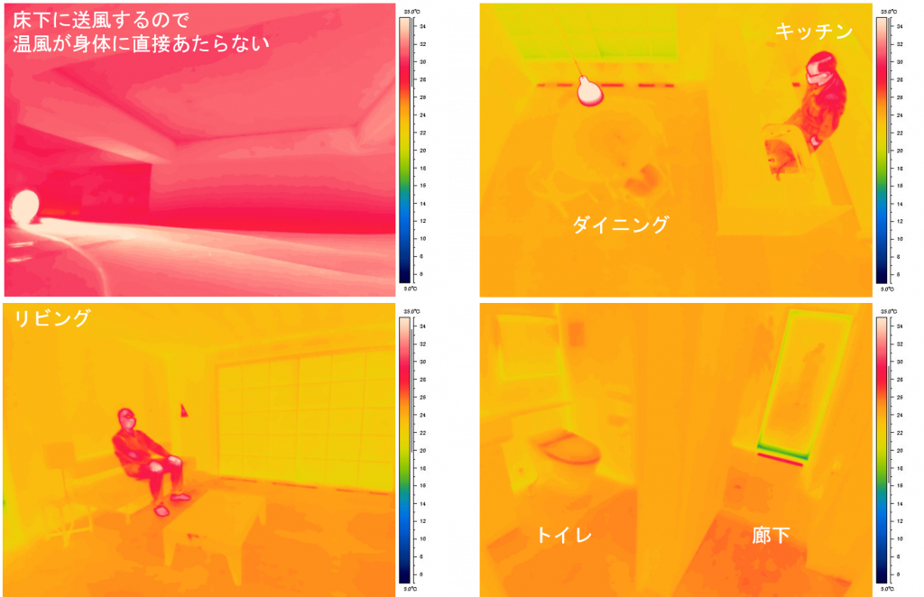 以下は、床下に温風を送り込むことで暖房する全館空調を設置した住宅の室内サーモ画像です。高温空気が吹き出すのは床下空間なので、乾燥感や気流感を床上の住民に感じされることはありません。