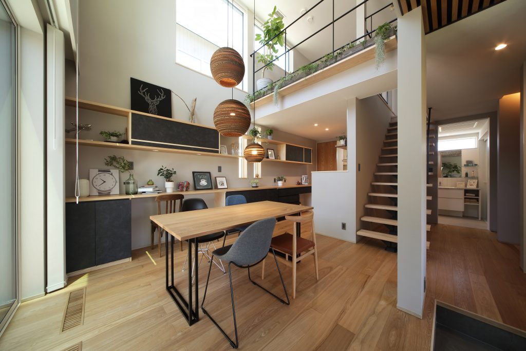 吹抜けのペンダントライトが特徴的な