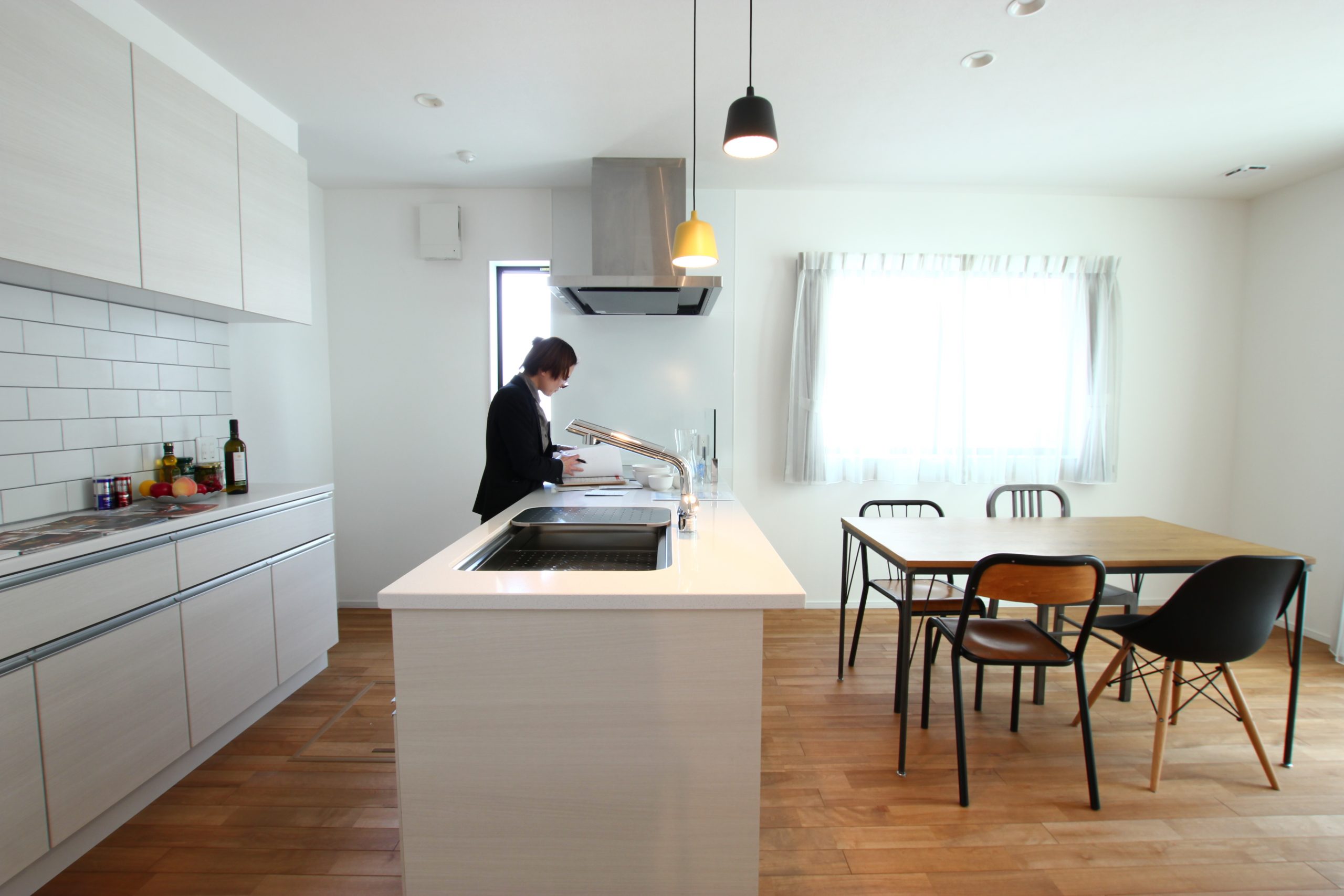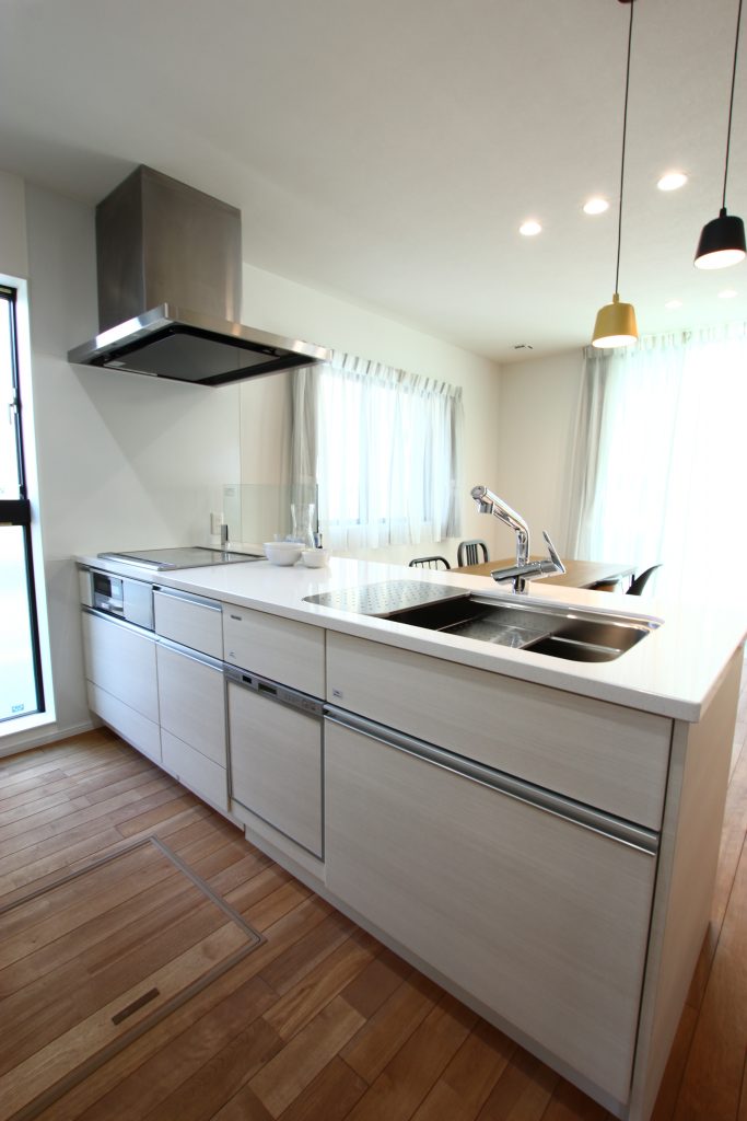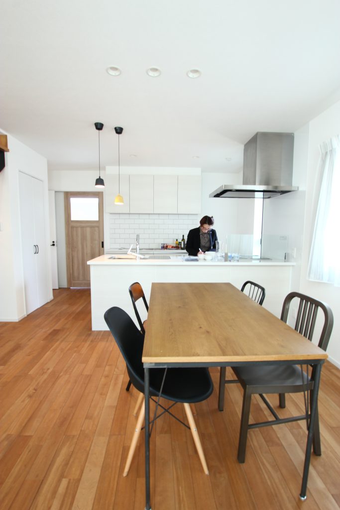 シンプルなペニンシュラ型。色味の落ち着いたホワイトのキッチンは無垢床とベストマッチ。