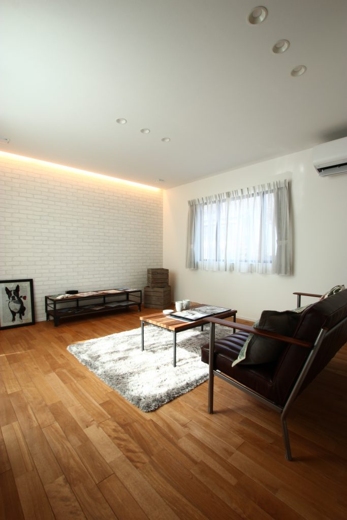 間接照明から漏れる優しい明りが、レンガ調の壁の素材感を引き立てる。部屋の用途に応じて照明を調光すれば雰囲気に可変性も持たせることが出来る。