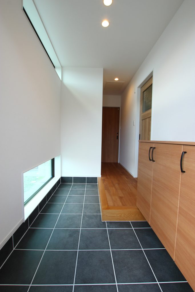 土間のタイルの目地がアクセントになり、奥行き感を持たせる。足元と天井につけられたモザイクガラスからは明るい光が降り注ぐ。