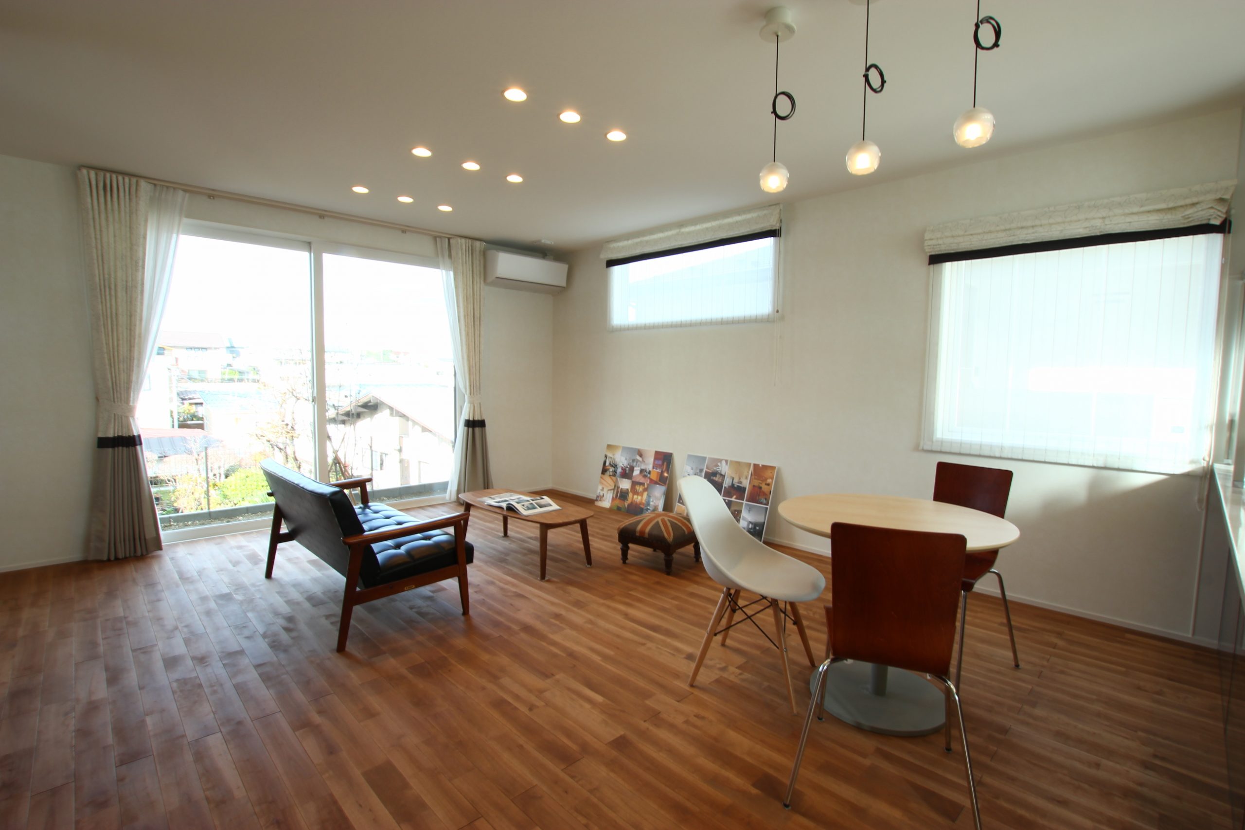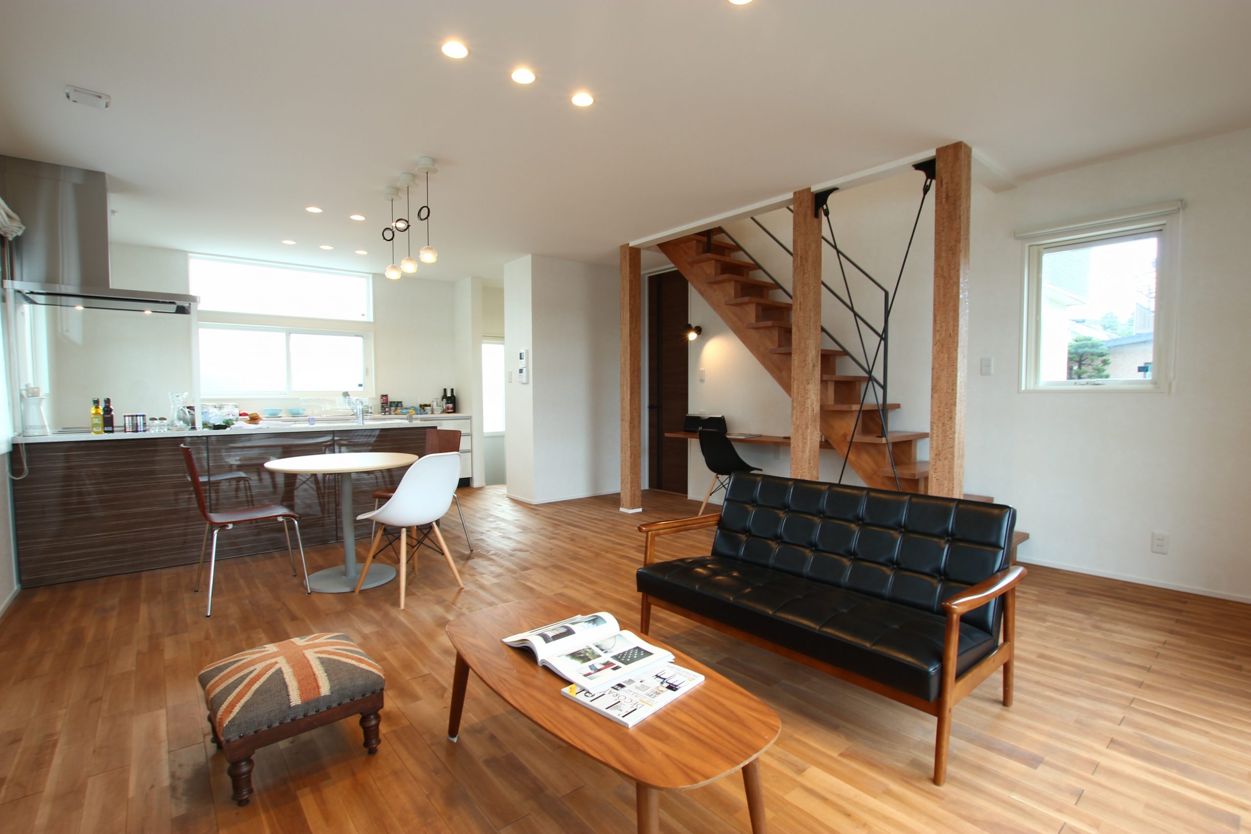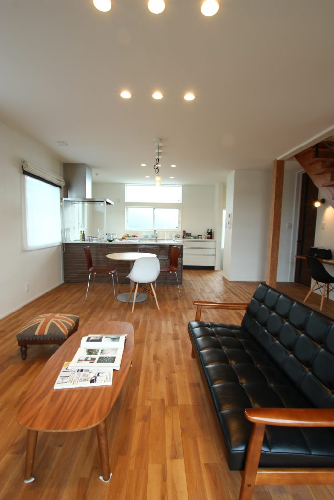 無垢フローリングに無垢柱を設えヴィンテージ感を表現したLDK。木のぬくもりと質感を感じられる空間を演出。