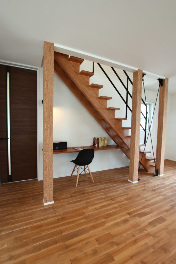 木質のストリップ階段の下に造作カウンターを設置し、「勉強・家事」となんでもできる家族共有スペースに仕上げました。