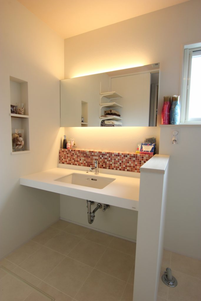 白を基調とした内装に、モザイクタイルをアクセントにしたカントリー調の可愛らしい洗面化粧台。