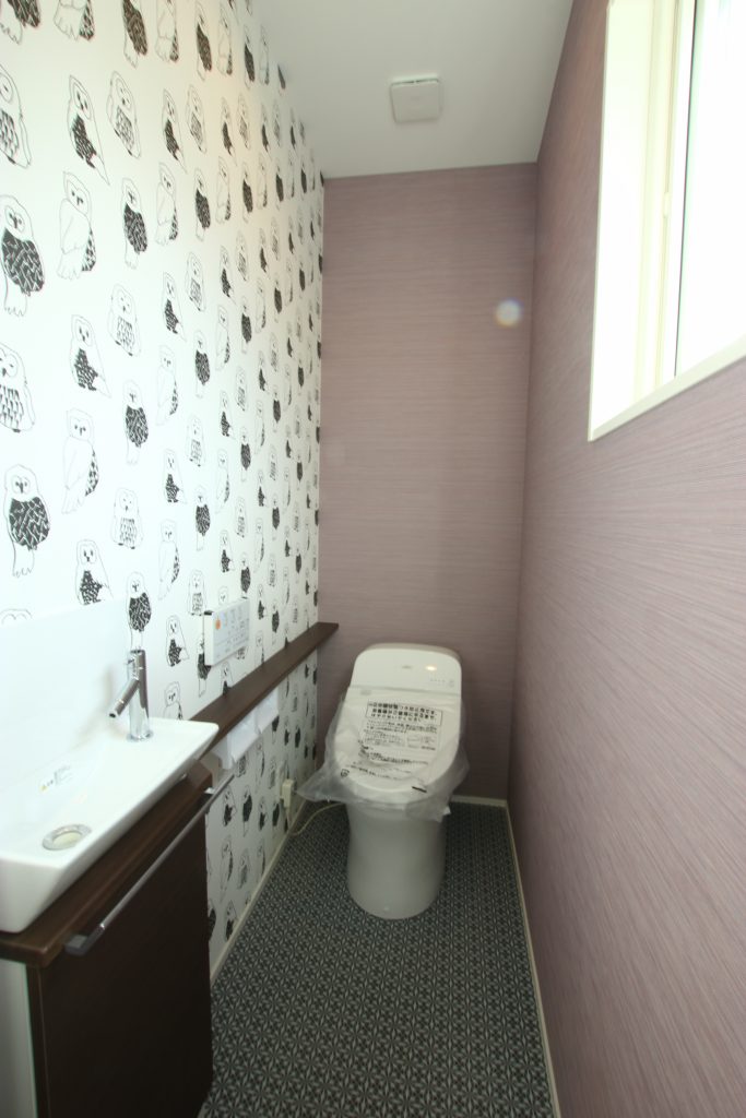 フクロウ柄のアクセントクロスでポップさが感じられるおしゃれなトイレ。